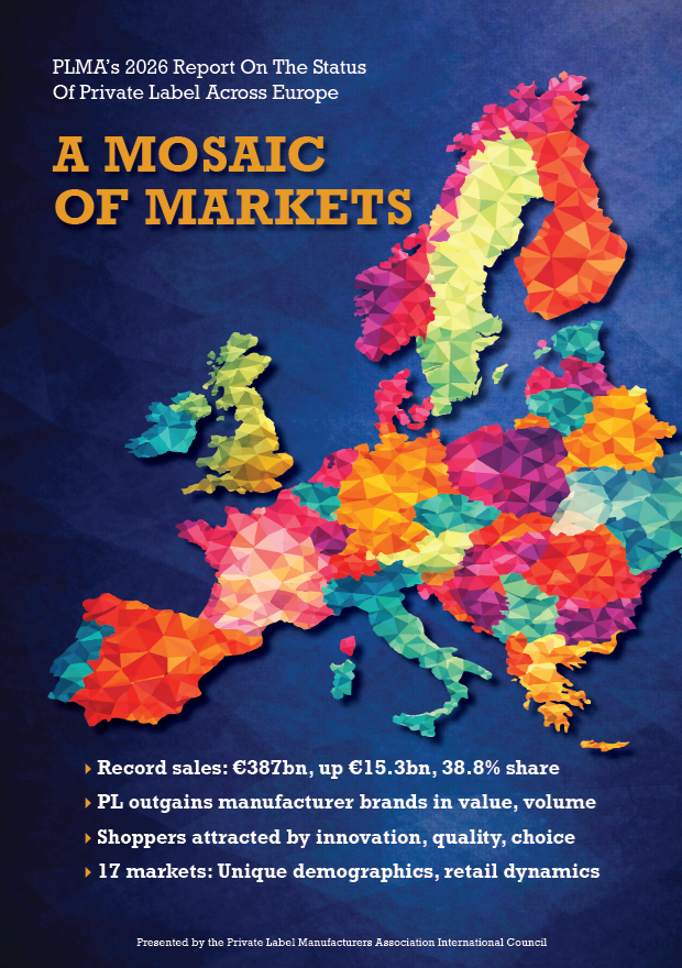 The report "A Mosaic of Markets: PLMA’s 2026 Report On The Status Of Private Label Across Europe" details sales results during 2025 of both private label and manufacturer brands across seventeen countries monitored exclusively for the Private Label Manufacturers Association International Council by NielsenIQ.