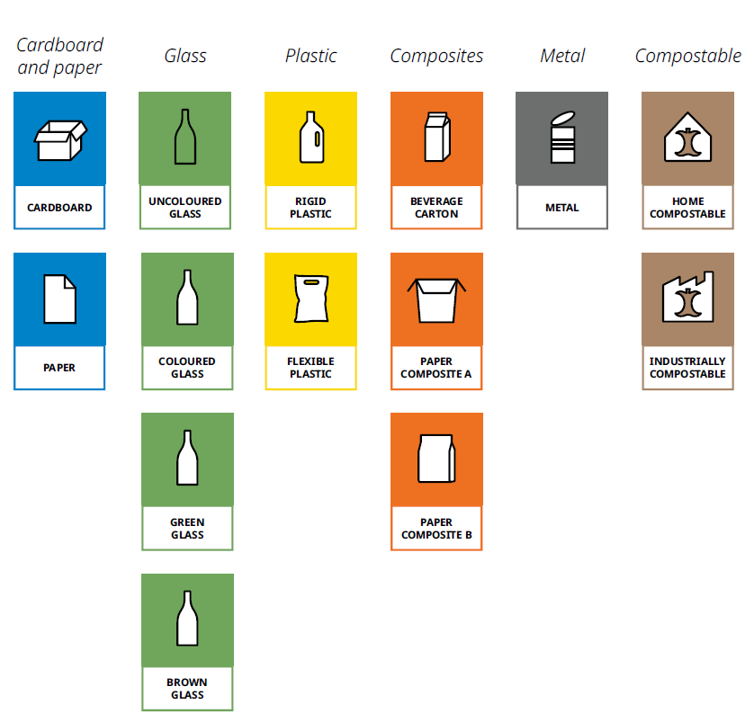 The system combines pictograms, colours and text and sets out specifications for label dimensions, placement and accessibility. Under the proposal, each label would indicate one material category, meaning composite packaging might require multiple symbols. Alternatives such as QR codes are also discussed for packaging where physical labels are less feasible.